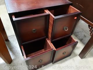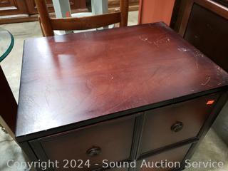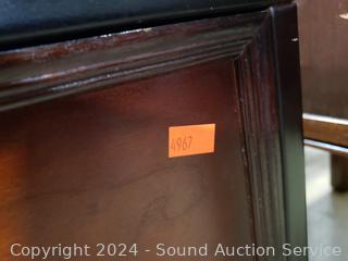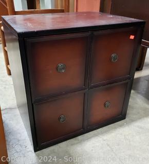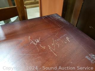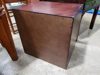 Some scuffs, scratches, wear to finish. 19.75" H x 19.75" W x14.5" D. Appears to be all wood construction.