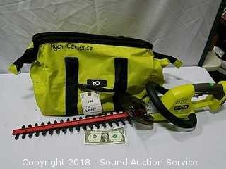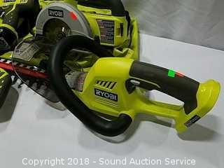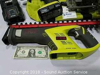 Includes: (1) battery, (1) charger, bag, hedge trimmer, circular saw, reciprocating saw, and drill.