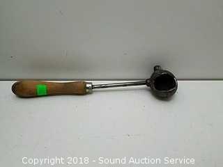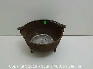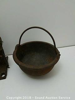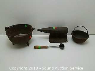 Includes: (2) cauldrons, ladle, and blacksmithing anvil. Anvil looks to be made out of a railroad track.
