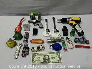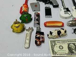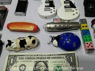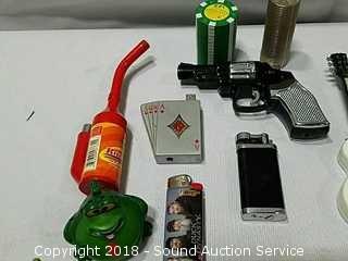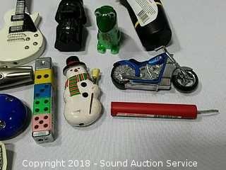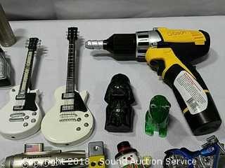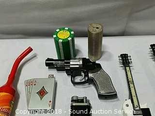 Includes: drill, guitars, pistol, gas tank, dice, poker chips, frogs, cow, hot dog, and more.
