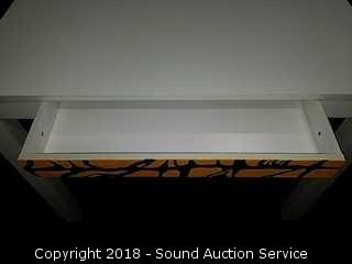 Desk has single drawer. Comes with matching tiger stripe office chair. Matches night stand in previous lot. Approx. 30" tall, 39" wide and 20" deep.