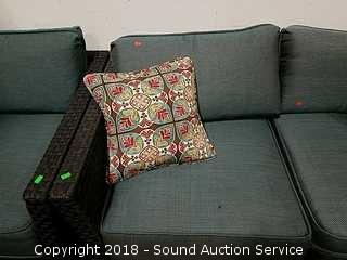 Includes: (2) easy chairs, loveseat with ottoman/bench. Made from a woven weather resistant material. Comes with two colorful throw pillows.