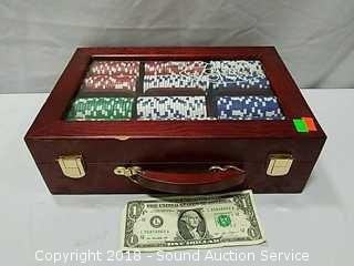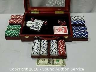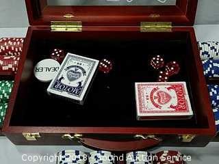 Comes with nice poker chips with pull out wooden trays, cards, and felt lined box.