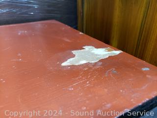 A couple of the panels have some damage, splitting, some scuffs, wear to finish from age use. Looks quite old. Approx. 53" H x 33.5" W x 18.5" D.