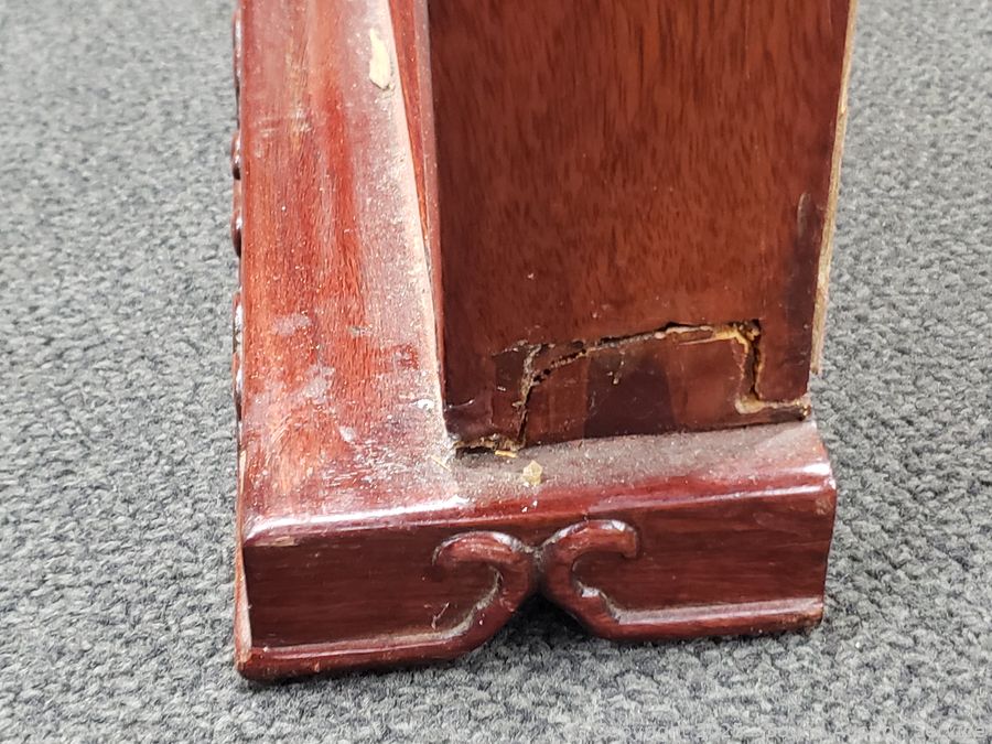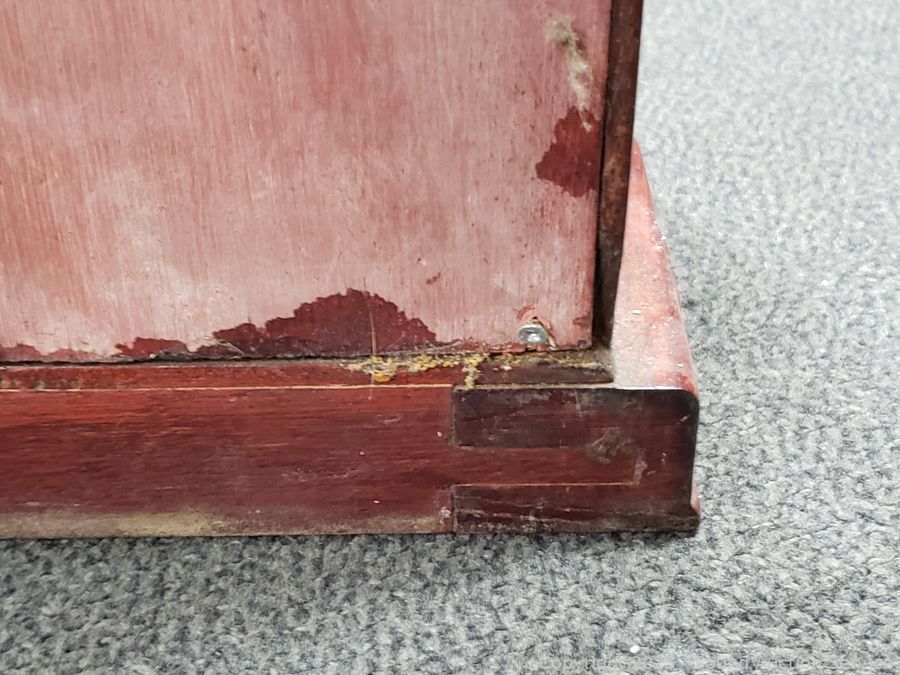 Door is not attached, missing glass, bottom right corner has been repaired at one time. Some scuffs, wear from use. 31" H x 19.5" W x 3.5" D.