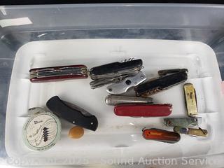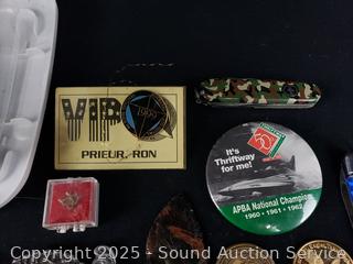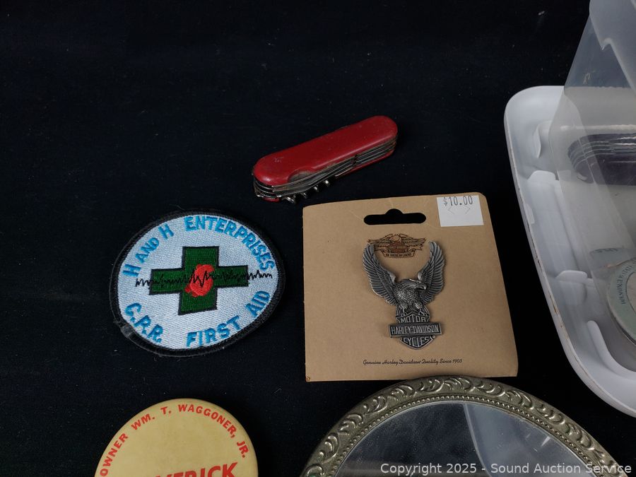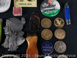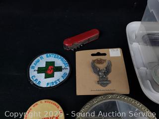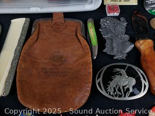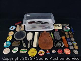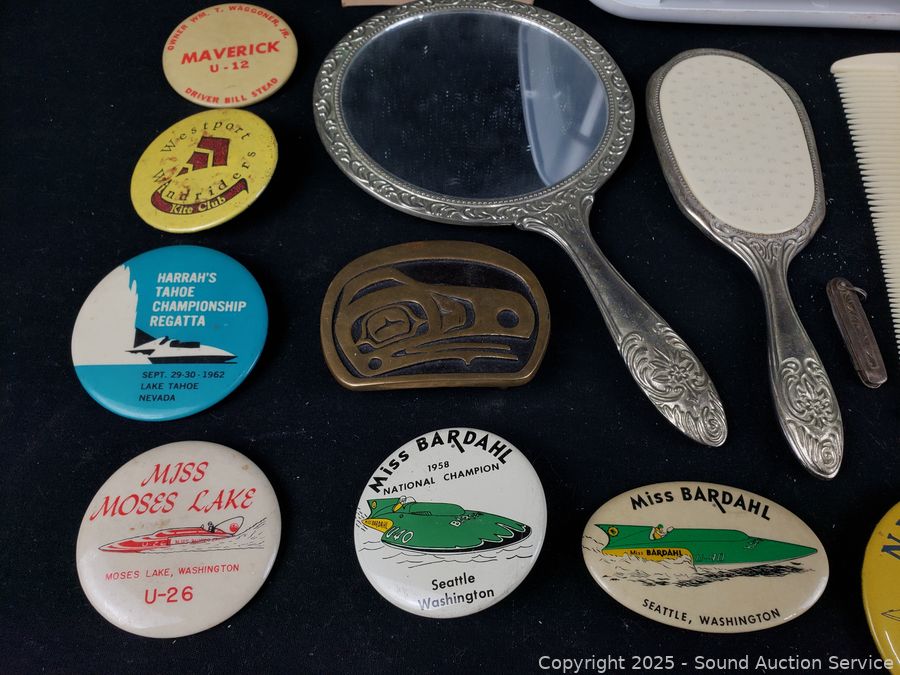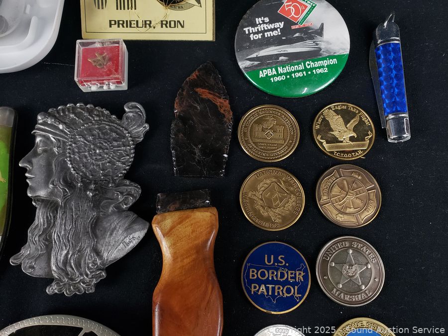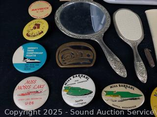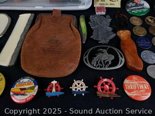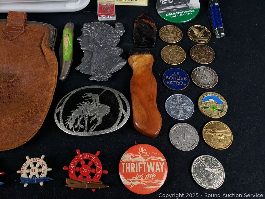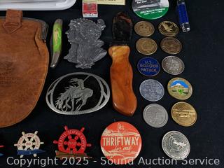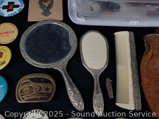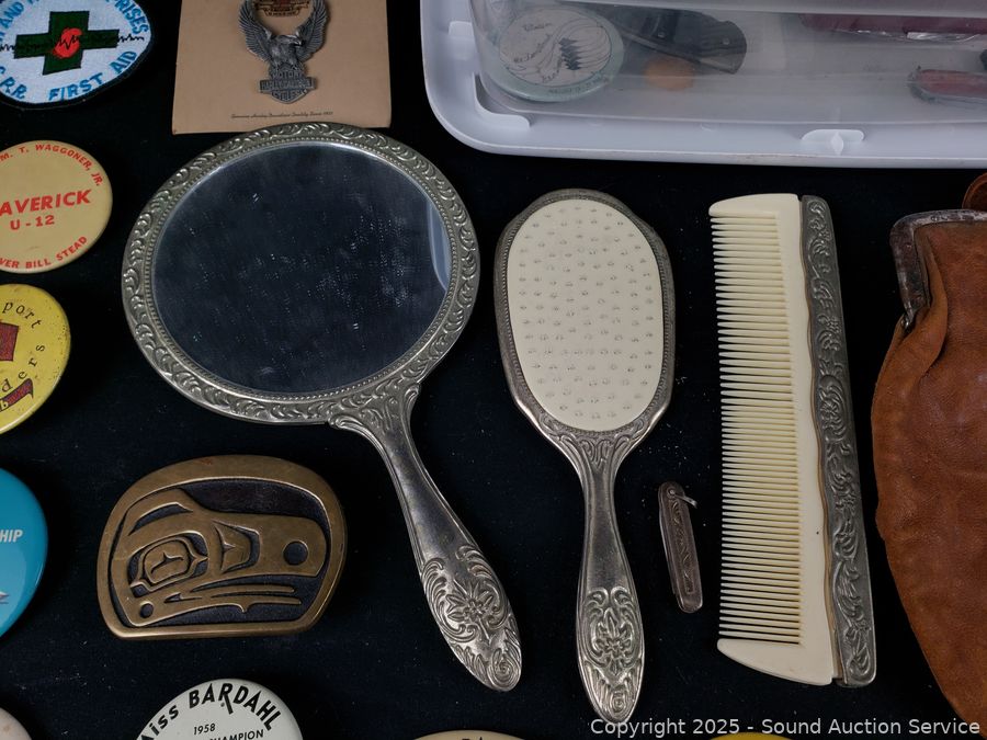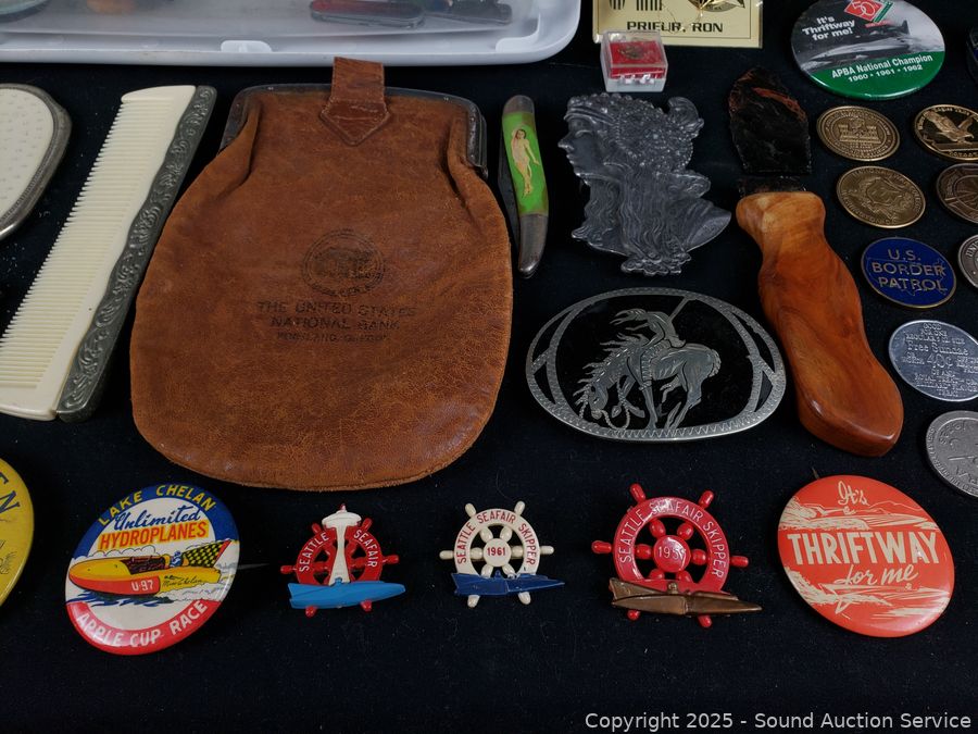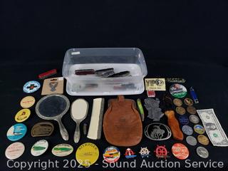 Lot #0097: Belt Buckles, Pocket Knives, Buttons, Vanity Set, Commemorative Coins