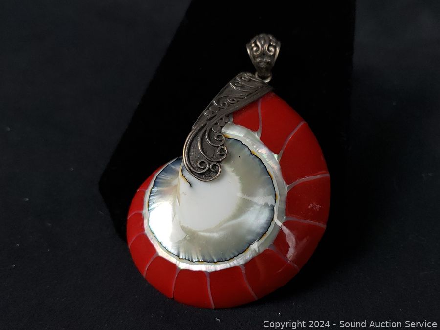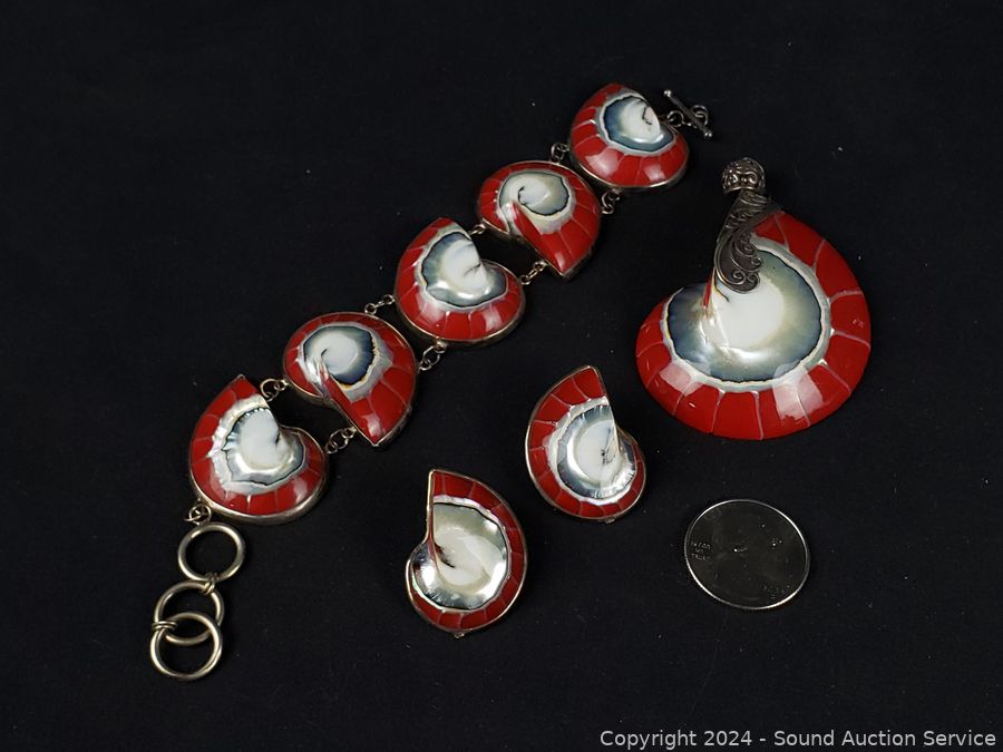 Pendant marked sterling w/signature. Other pieces are unmarked. All tested silver. Did not weigh, a lot of shell weight.
