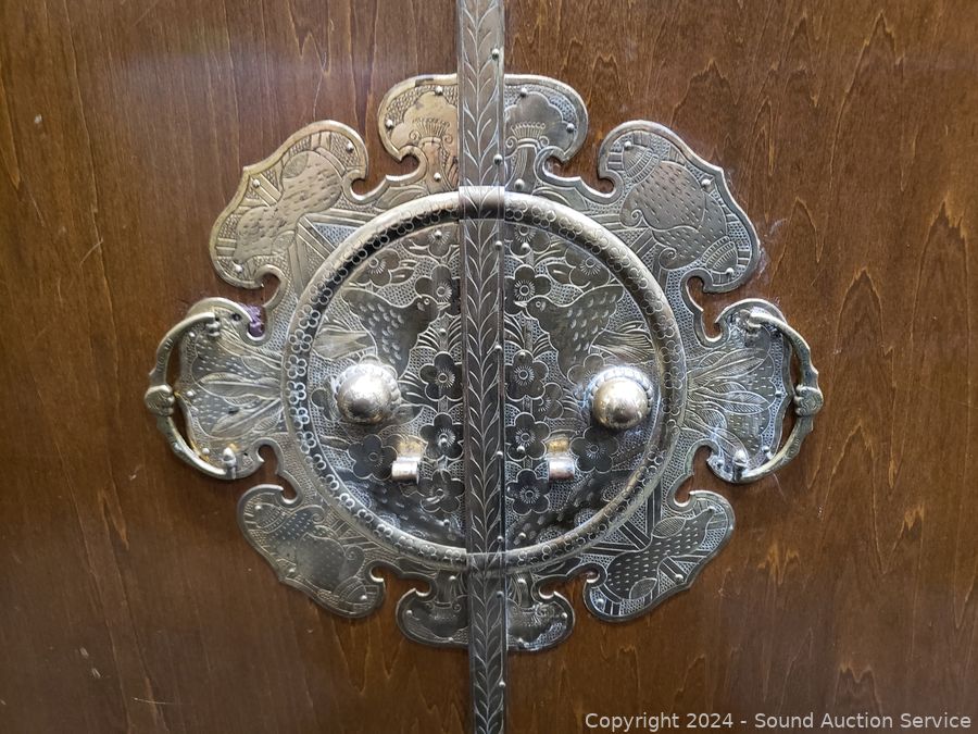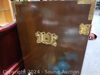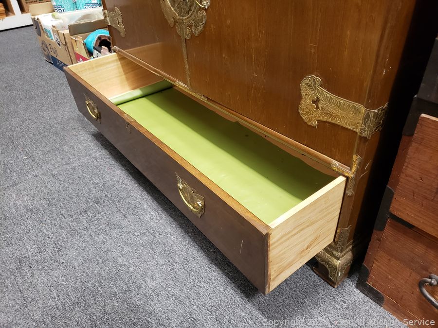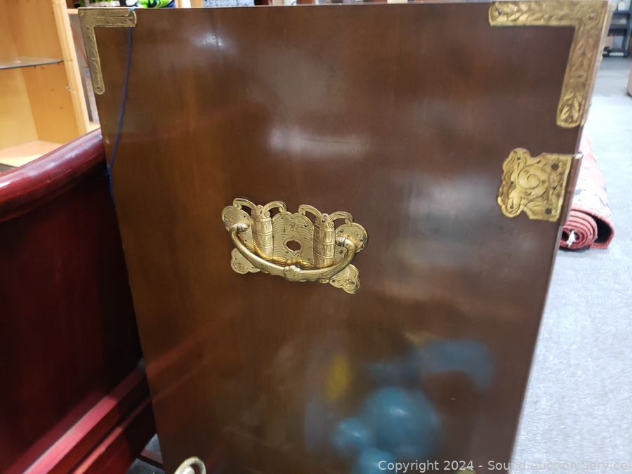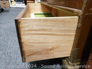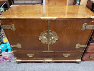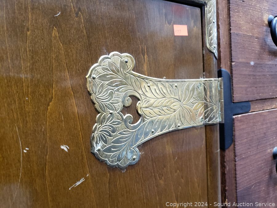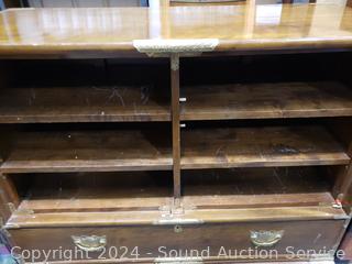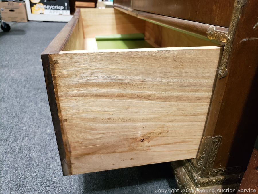 Solid wood construction, ornate carved brass hardware & accents. Locking drawer, no key. Handles on the sides are coming free, need refastened. Some scuffs, wear to finish. 38" H x 48" W x 19.75" D.