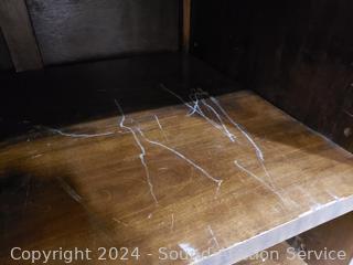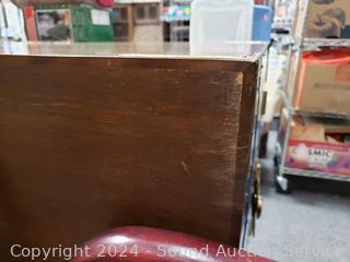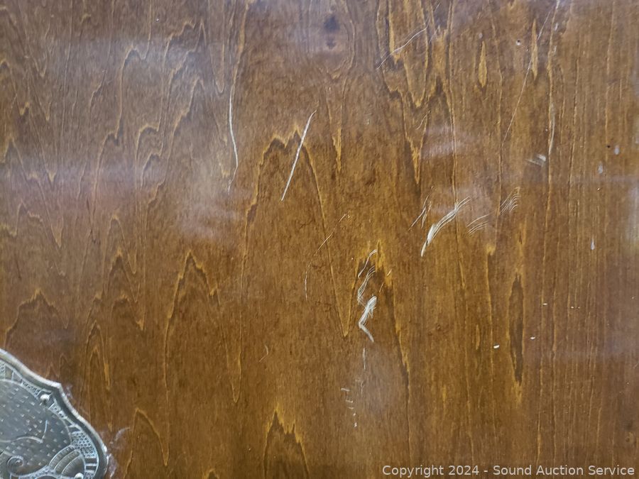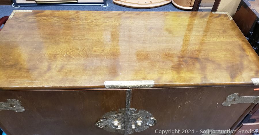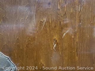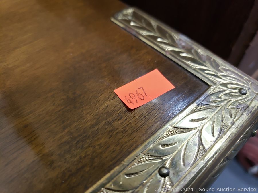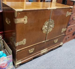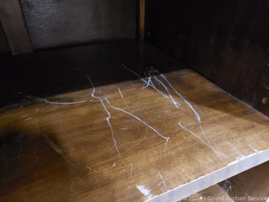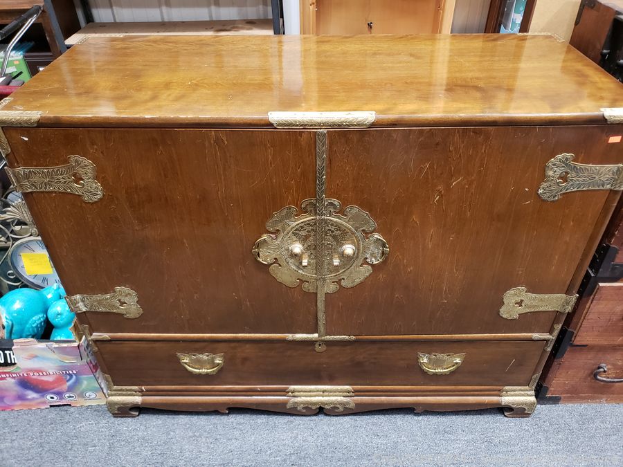 Solid wood construction, ornate carved brass hardware & accents. Locking drawer, no key. Handles on the sides are coming free, need refastened. Some scuffs, wear to finish. 38" H x 48" W x 19.75" D.