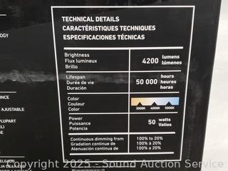 50W, 4200LM, 3000-5000K color. Appears to be functioning as intended. Missing mounting screws, otherwise good condition. 12" x 48".