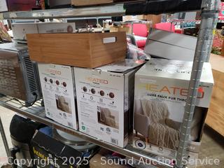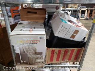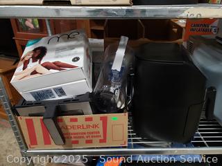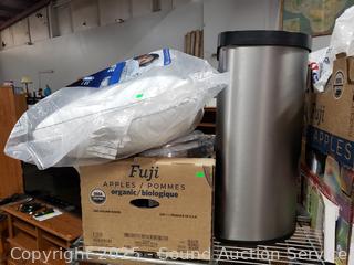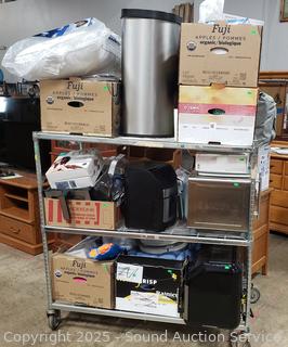Stainless steel step trash bin (step not working properly, some dents), Countertop air fryers, pillows, heated blankets, ceiling light, bamboo countertop organizers, hair dryer, scale, string lights, etc. Cart NOT included. ATTN: All items are used, may be missing pieces, damaged, not functioning, complete, no issues, etc. All items as is. Refer to photos for more details.