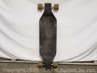37" L x 9.25" W. Unsure on brand, wheels are marked Monster Hawg. Signs of wear from use.