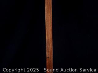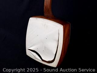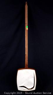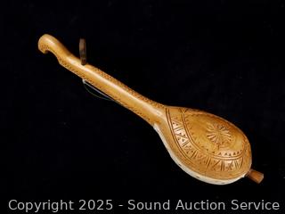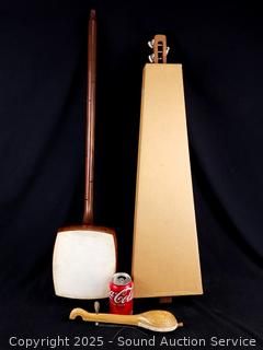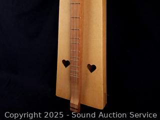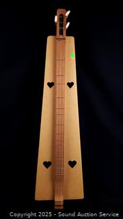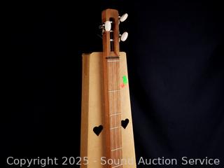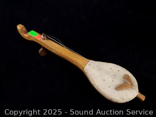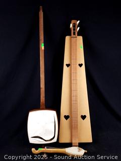 Cardboard box lap dulcimer. One is missing strings has a damaged drum, not sure what it is some sort of banjo? Small carved instrument, has some broken strings. Approx. 12" to 33" lengths.