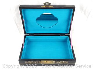 3.5" x 12.5" x 8.5" jewelry box, in great cosmetic condition, don't see any issues. 15" H x 21" glass leaf/flower tree, some pieces have fallen off.