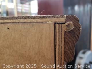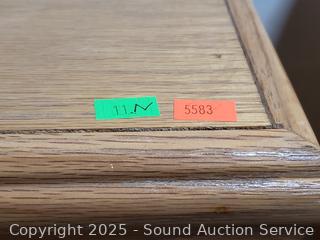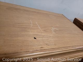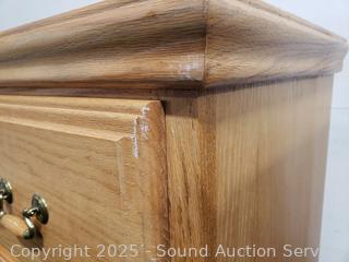 All wood construction, missing one of the drawer pulls. Ball bearing drawer guides. 53" H x 37" W x 17.5" D. Some scuffs, scratches.