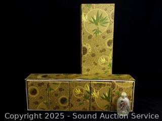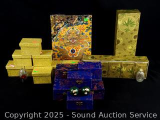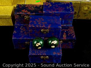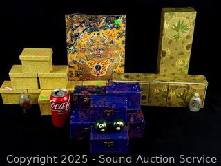 (2) 10pk of reverse painted glass snuff bottles, (8) reverse painted glass eggs with stands, (8) sets of Baoding balls, Imperial Arts of China book.