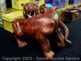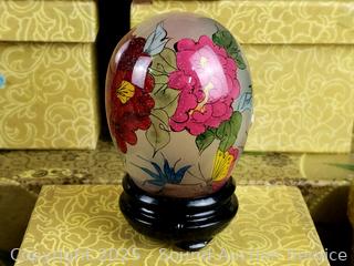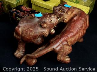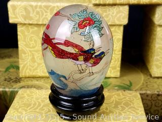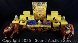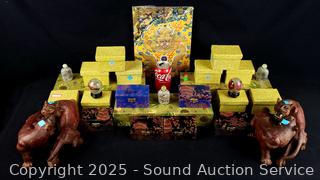 (3) 10pk Reverse Painted Glass Snuff Bottles, 4 Carved Wood Tigers, 10 Reverse Painted Glass Eggs w/Stands, 6 Baoding Ball Sets, Imperial Arts of China book. Refer to photos for more details.
