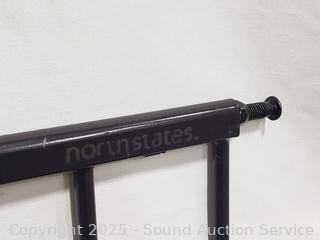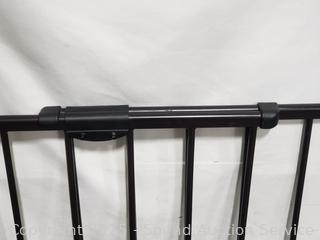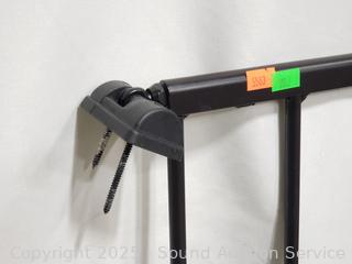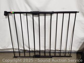 Pet gate is missing mounting hardware, also I can't get it to slide, may be user error, 29" H x 37" W. Stool 16" H x 15.5" x 15.5".