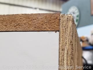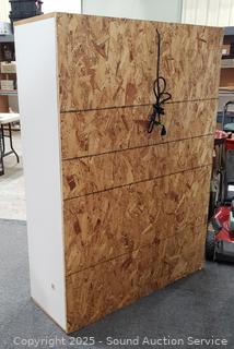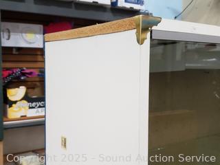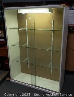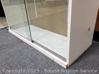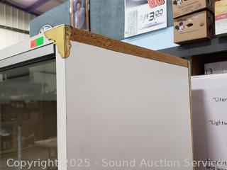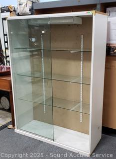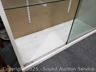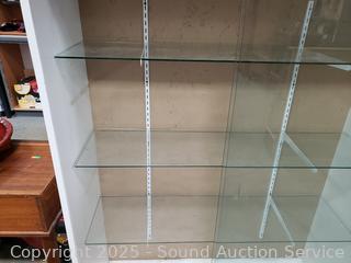 3 adjustable glass shelves. Missing some laminate on the sides. Approx. 62" H x 45" W x 16" D.