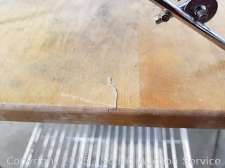 Middle shelf has ball bearing drawer guides, slides out. Various wear from age, use. 34.5" H x 21" x 15". Small folding rack, 7.5" x 19" x 14".