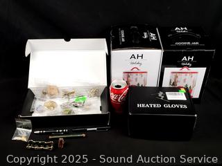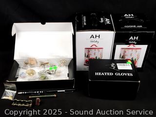 Lot #0151: Heated Gloves, Fashion Jewelry, 2 Holiday Ceramic Cookie Jars