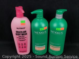 25.4oz Nutrious Brazilian Body Wash, 32oz Nexxus Shampoo & Conditioner Unbreakable. All bottles are full or mostly full.
