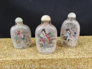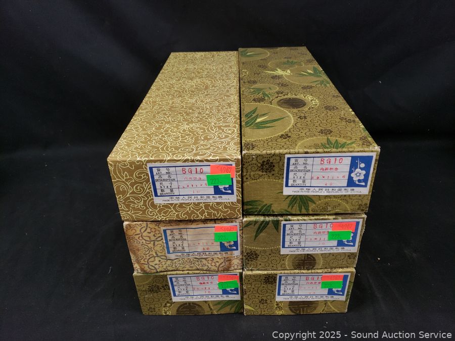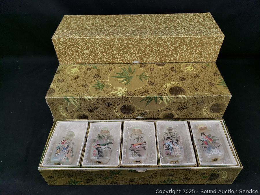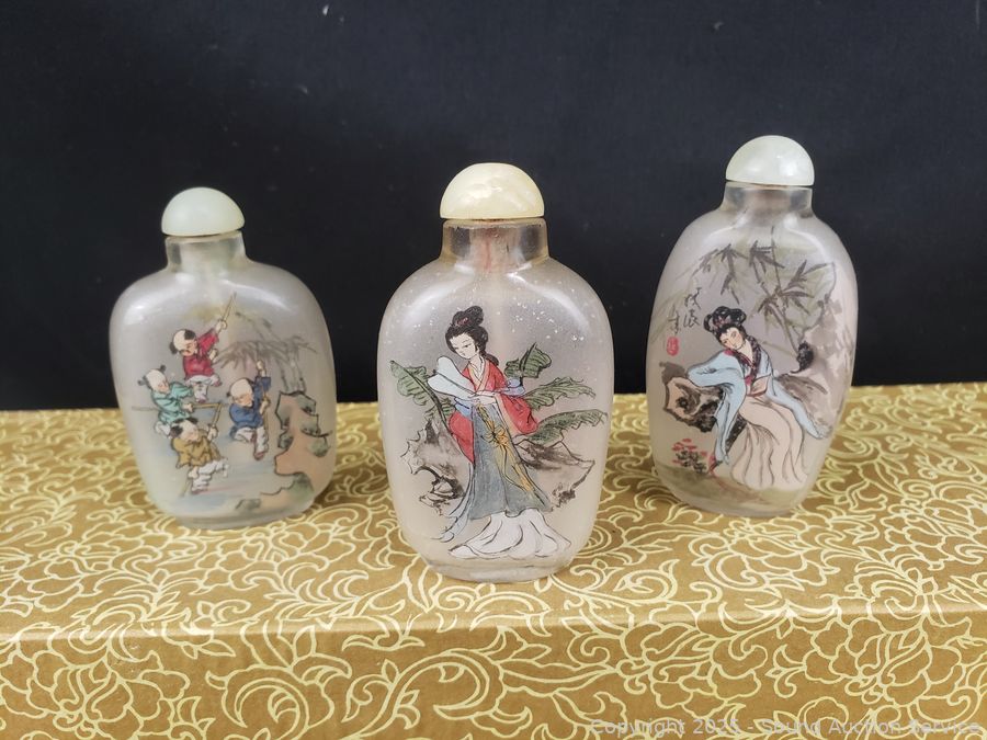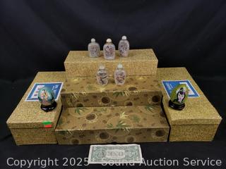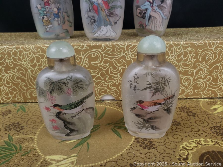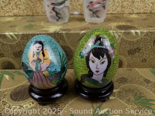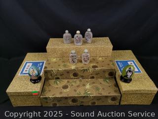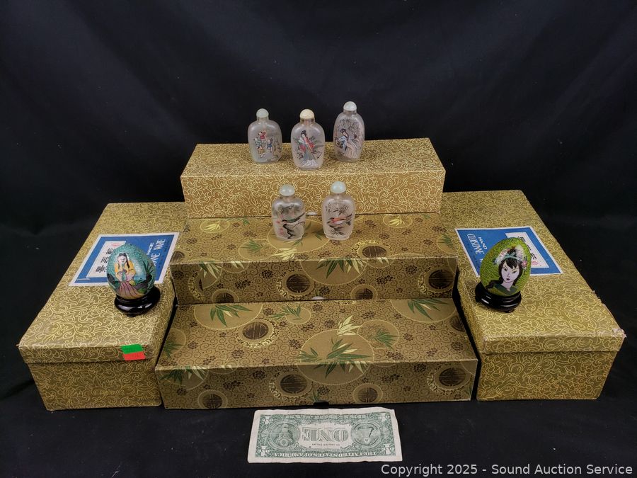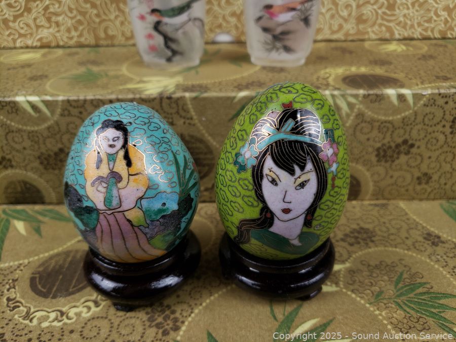 Lot #0223: (2) 10pk Cloisonne Eggs, (6) 10pk Reverse Painted Glass Snuff Bottles