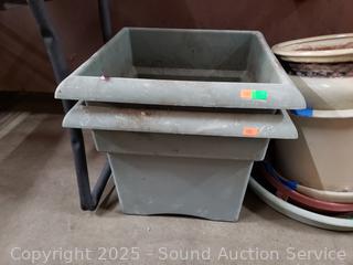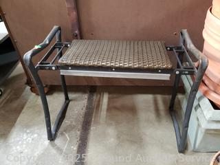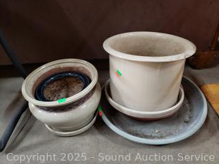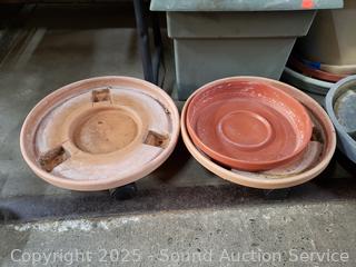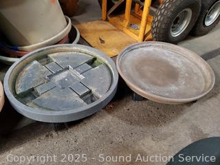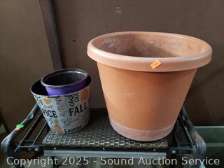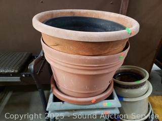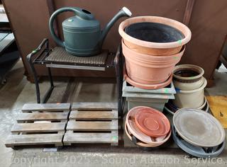 Lot #0019: Assorted Planter Pots, Kneeling Bench, Watering Can, Pot Stands/Carts