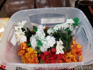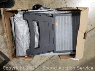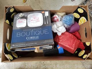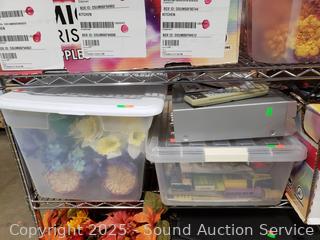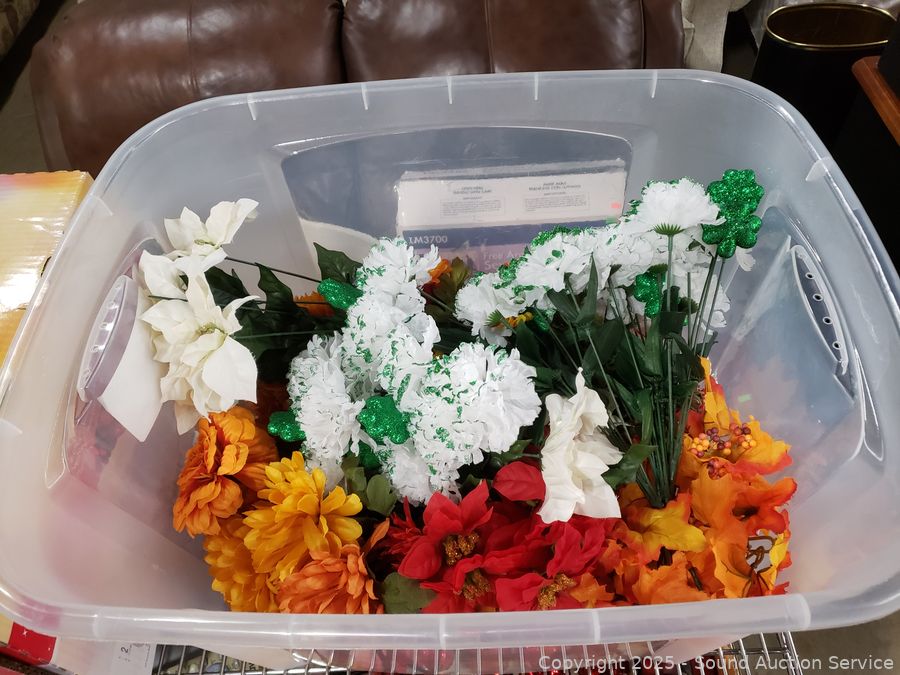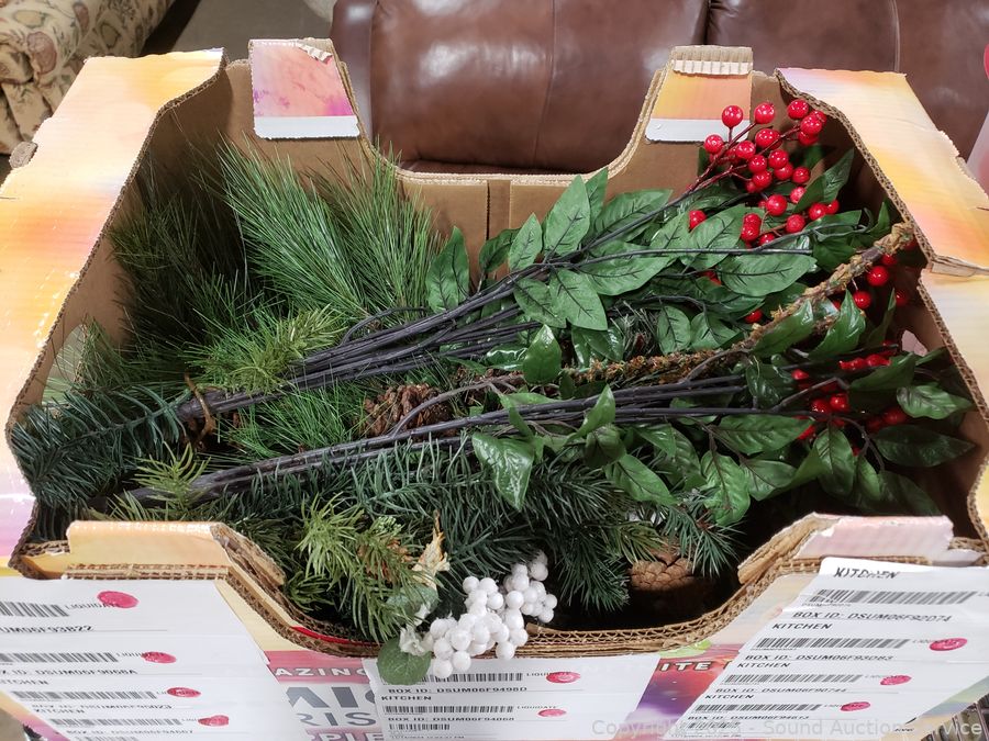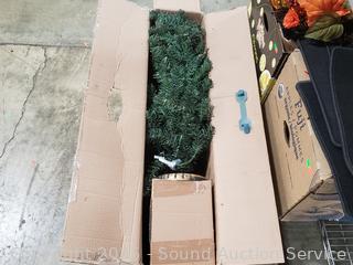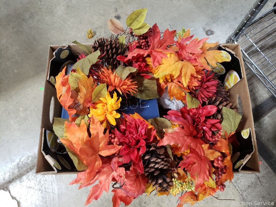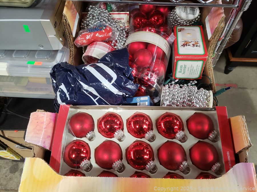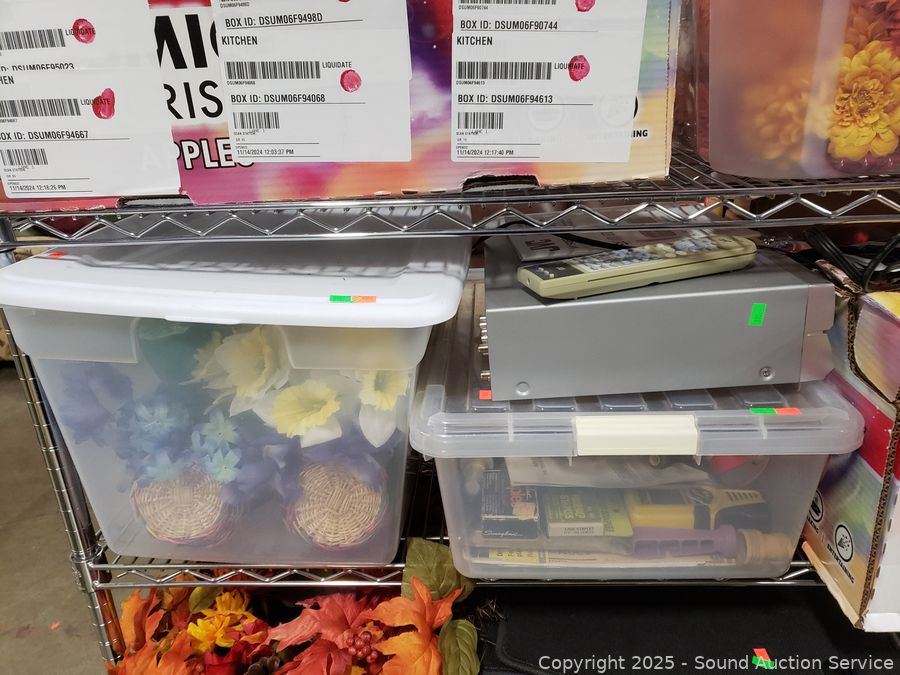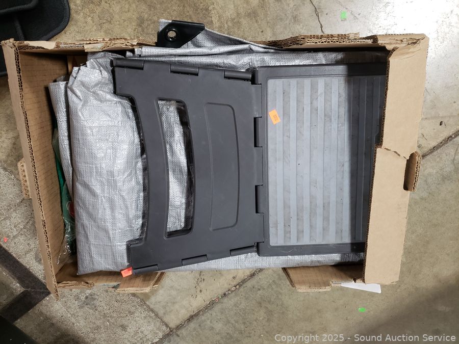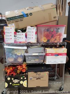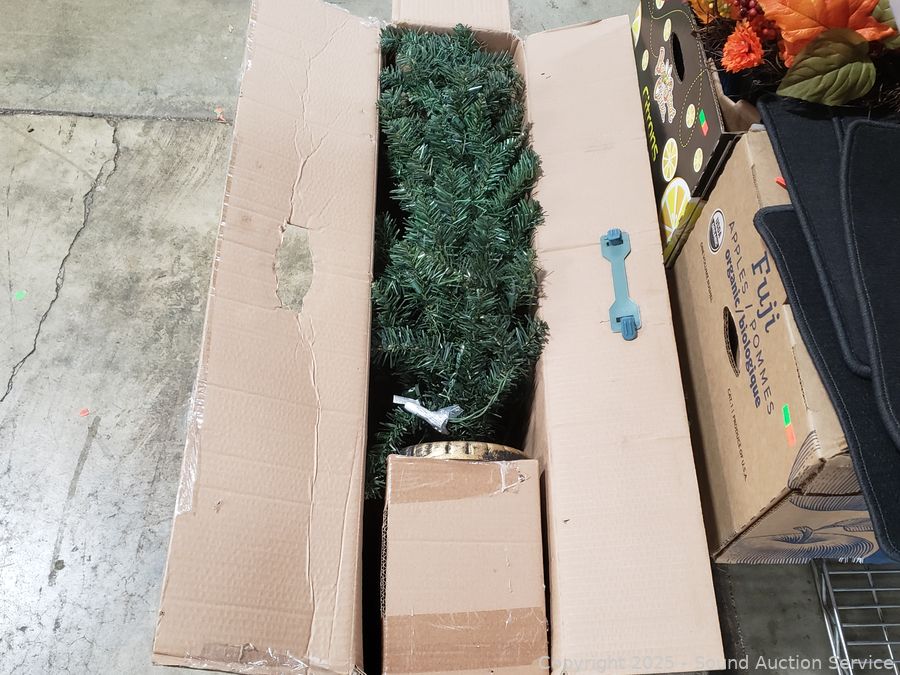 Assorted fall decor, ornaments, vehicle floor mats, artificial Christmas tree, VHS player, stud finder, staples, string lights, etc. Cart is NOT included. Don't see any issues.