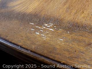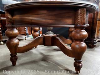 Some wear to finish on the base top, small chip in base top. 20" H x 42" Dia. coffee table, 25.5" H x 26" W x 27" D.