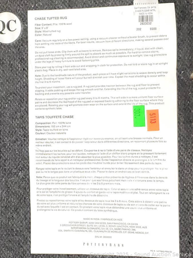 Lot #0303: Pottery Barn 100% Wool Natural 5ft x 8ft Tufted Rug