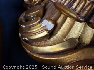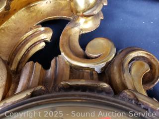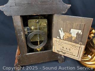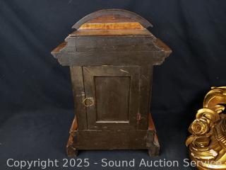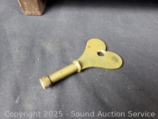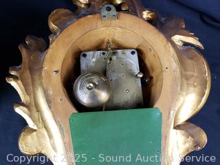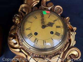 Both ran for a few seconds and then stopped. Comes with 1 key that works for both. Gold gilt one has various chips in finish. Gold one is marked Wasterstrand Toreboda 24" x 12", other is marked H.A.C. 14 Day Strike14.5" H x 10" W x 5.75" D.