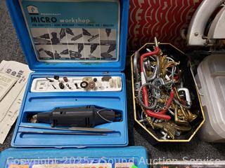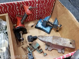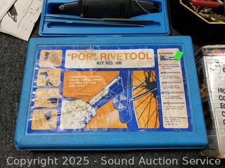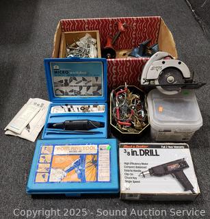 Skil 4.5" circular saw, Vacu-Vise, Pop Rivet tool kit, vise, screw, peg board hooks, etc. Refer to photos for lot contents, more details.