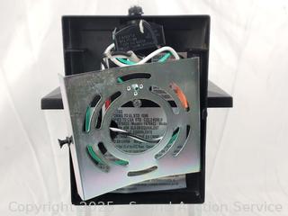 Appears to be functioning as intended. Previously installed, mounting plate is bent out of shape. 11.5" H x 7" W x 8" E.
