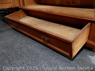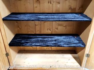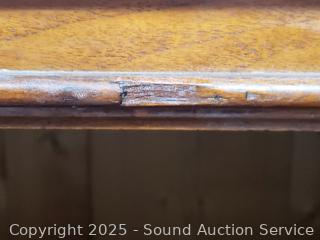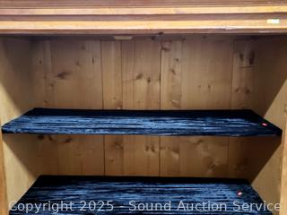 Appears to be solid wood construction, shelves are wrapped in black velvet, single drawer (wants to push in nothing to stop it after flush), skeleton key lock, NO key. Carved leaf accents in the door. 75" H x 50" W x 21.5" D.