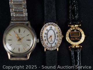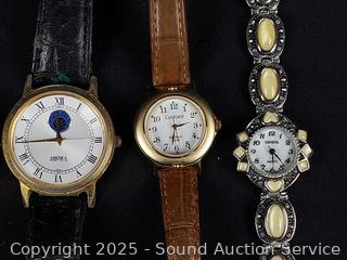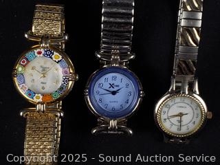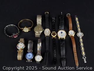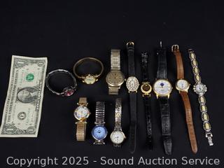 All appear to be quartz & need new batteries. Refer to photos for lot contents, more details.