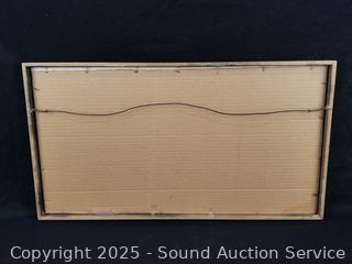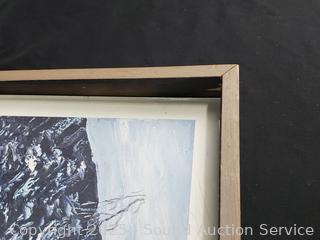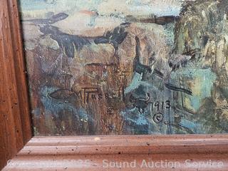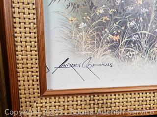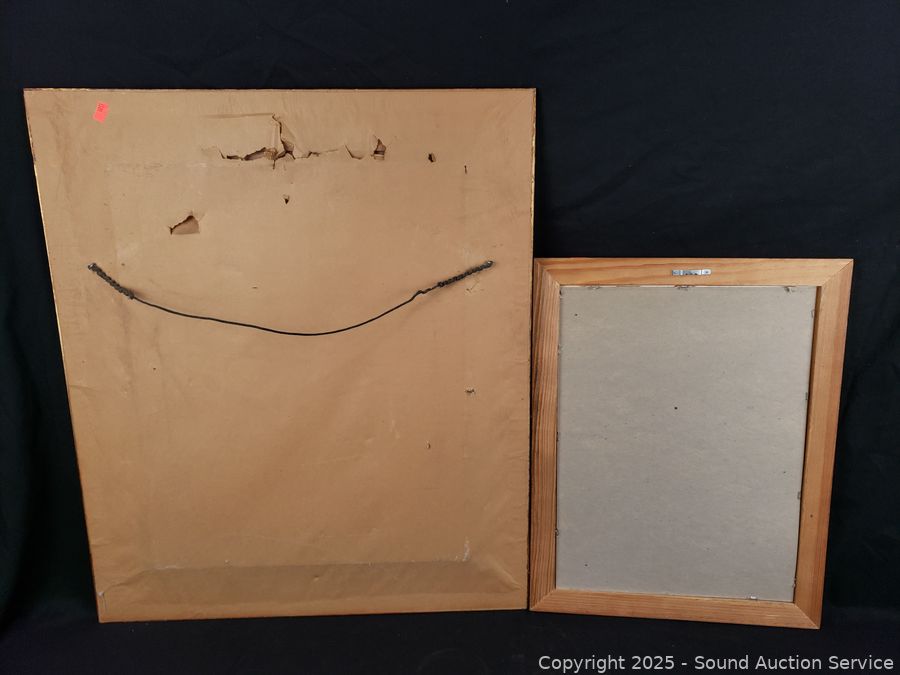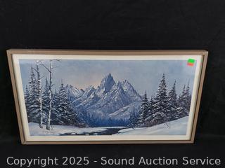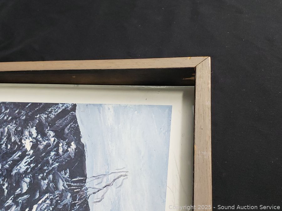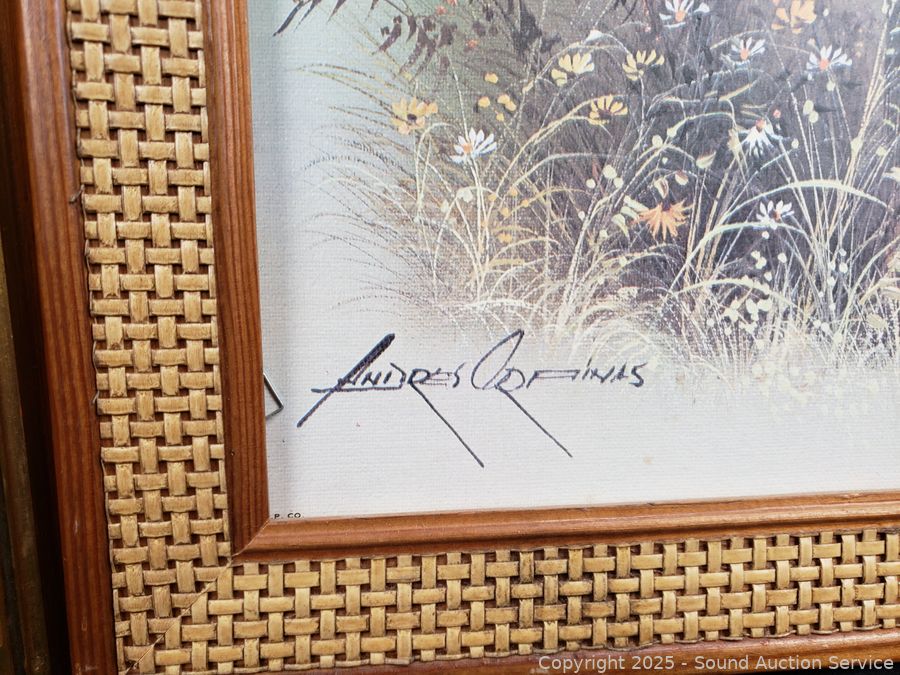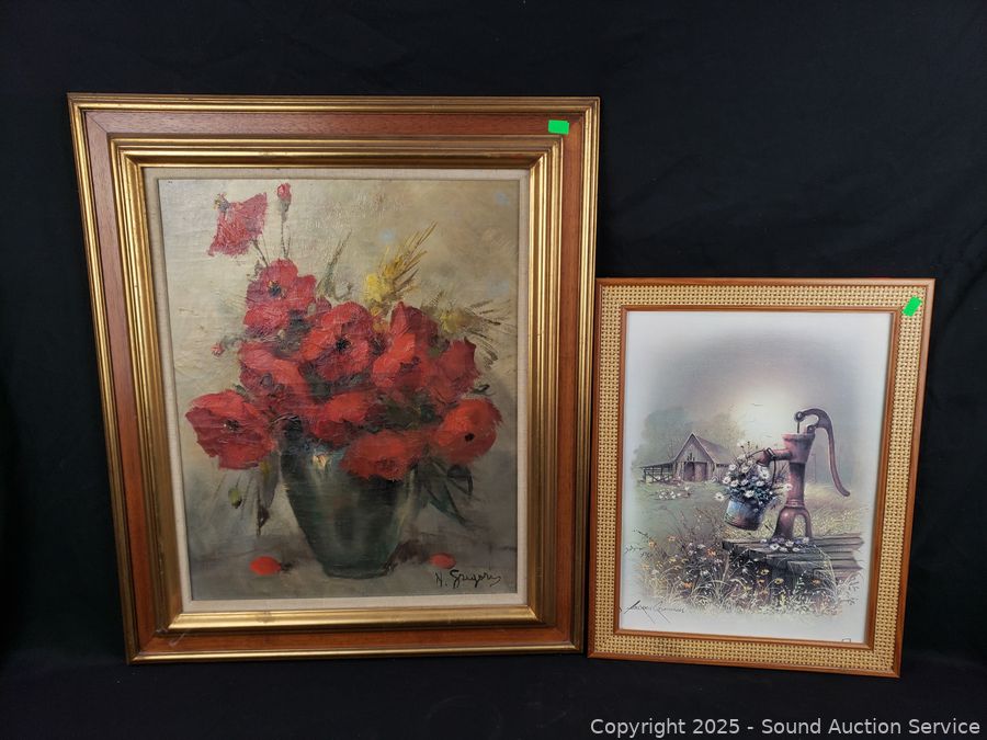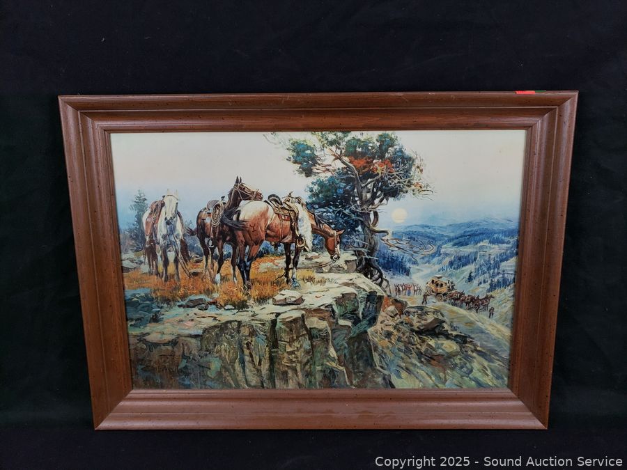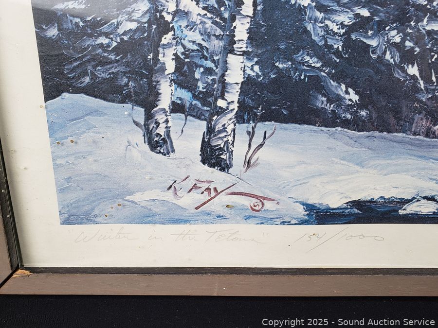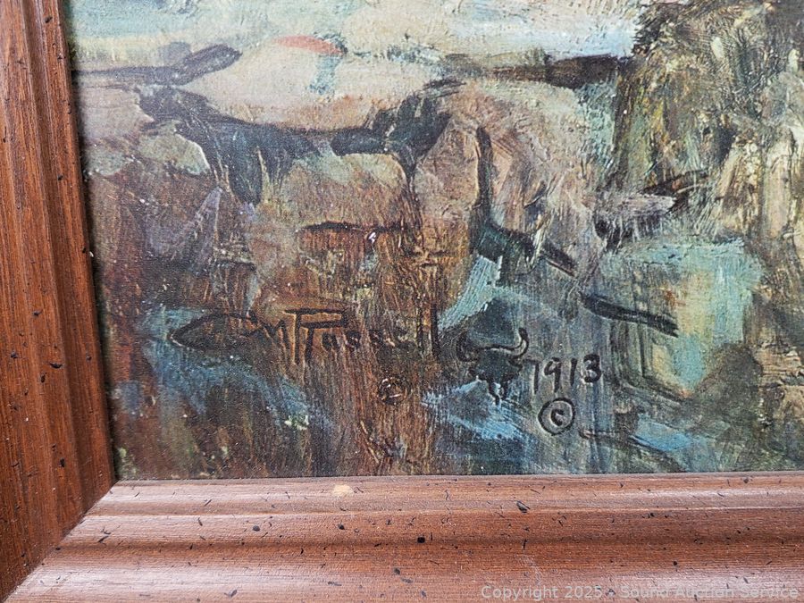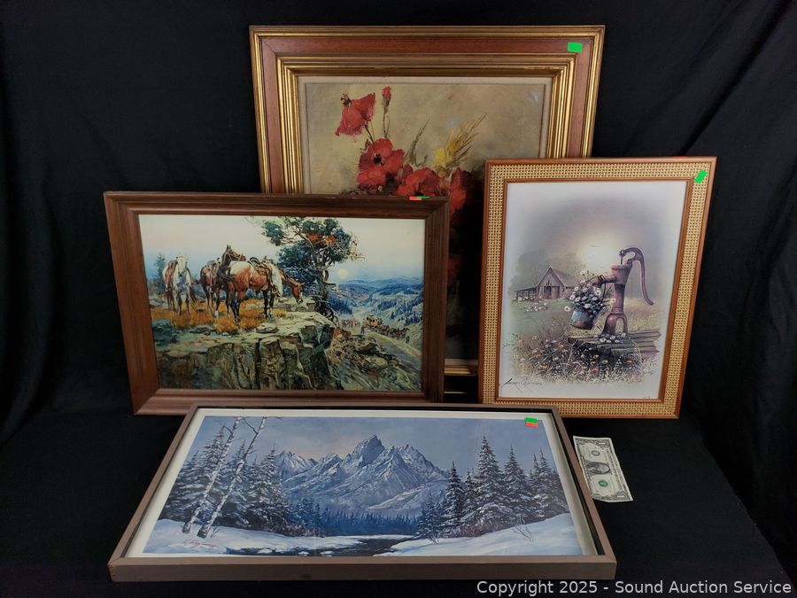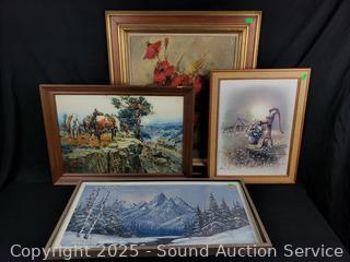 K.Fay limited #150/1000 Mountain scene lithograph, 14.5" x 26.5". Farmhouse Print 18.75" x 14.5". C.M. Russell Western Print, 16.5" x 22.75". Original signed still life floral painting, refer to photos for signature, 26.5" x 22.5". Refer to photos for more details.