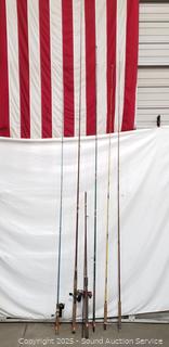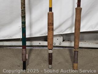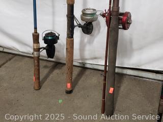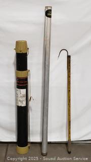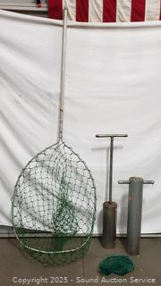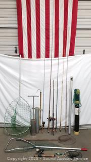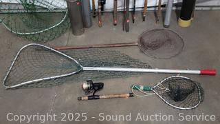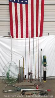 Lot #0071: Assorted Fishing Rods, Reels, Landing Nets, Clam Guns, Gaff Hooks