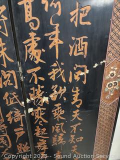 Carved & painted, black lacquered finish. Some chips wear to finish. Approx. 8ft tall, each panel is 18" W. Need 21 pins to connect all panels together, only have 19. 2 panels make up each screen.
