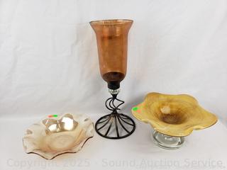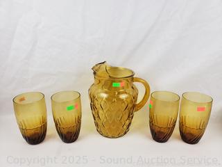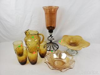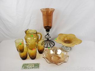 Hurricane Vase, Compote, Bowl, Pitcher, 4 Tumbler. Refer to photos for lot contents, more details.
