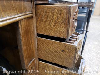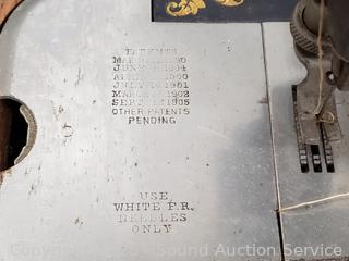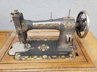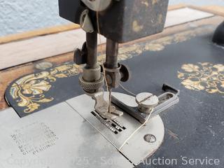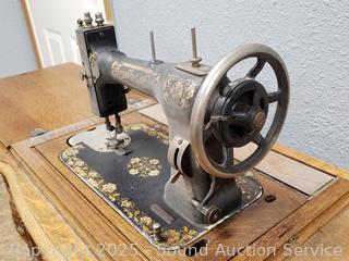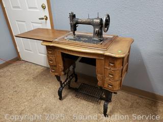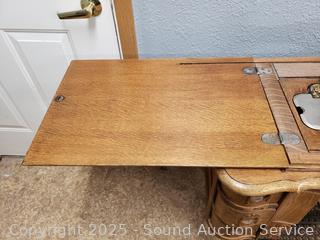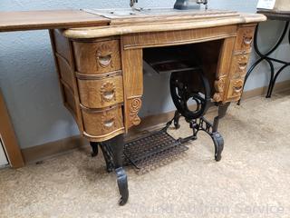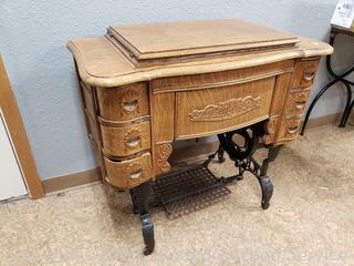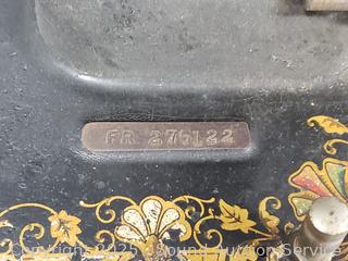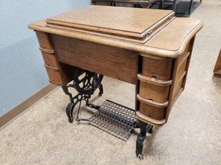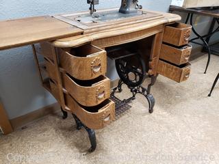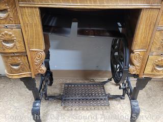 Quartersawn oak cabinet with foot attachments, bobbins, 6 drawers. Belt is broken needs replaced. Treadle works, needle is moving when hand spin the wheel. Serial FR276122. 30.5" H x 33.5" W x 17.5" D.