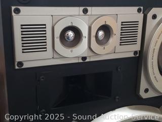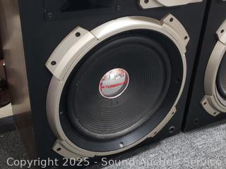 Plastic fins on one has broken off, some scuffs, wear to cabinets finish. Don't see any issues with speakers, appear to be functioning as intended. 25.5" H x 16" W x 11.25" D.