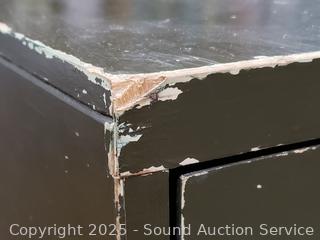 Various scuffs, wear to finish, chip in on corner. Has a musty odor. Approx. 51" H x 16" W x 28" D.