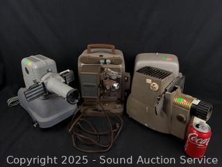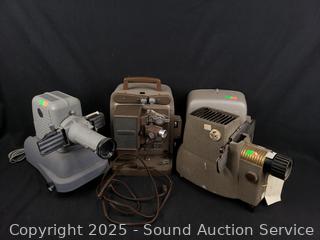 Auto Load Bell & Howell (damaged cord), TDC Duo (parts/repair), Viewlex (has power, not functioning). Refer to photos for more details.