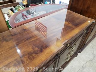 Appears to be all wood construction, dovetail joinery. Protective beveled glass top. Some wax residue inside the cabinet, otherwise in great cosmetic condition. divided center drawer with removable tray. 32.5" H x 73" W x 20" D.