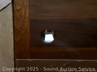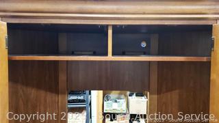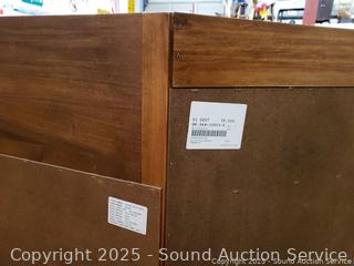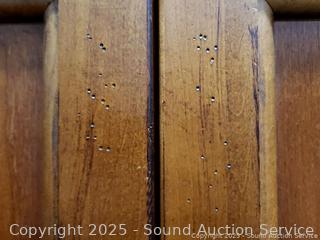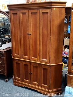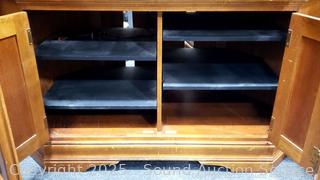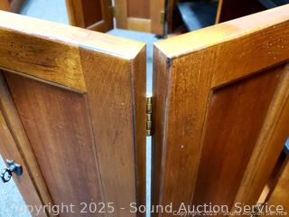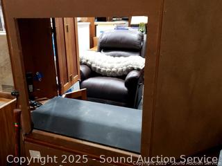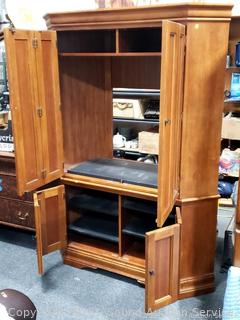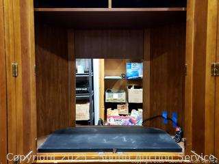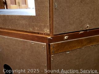 2 pieces for easier movement. Bifold doors, all the magnets to hold doors closed are damaged. Built in power supply, 38" W x 33" H opening. 78.25" H x 53" W x 21" D.
