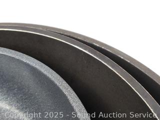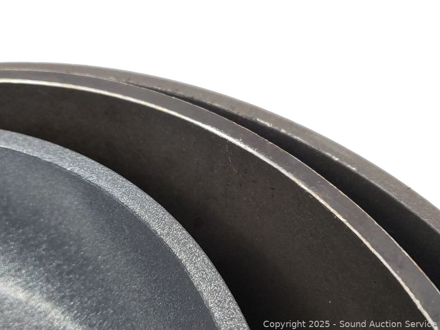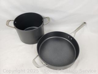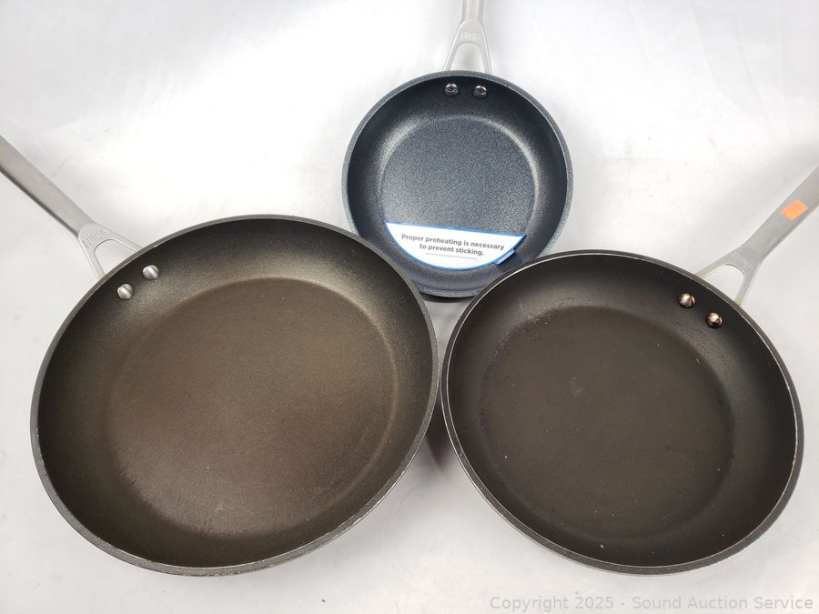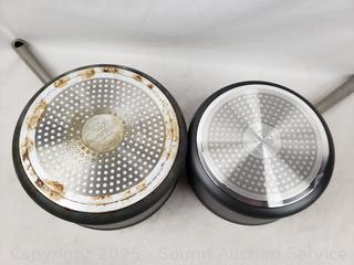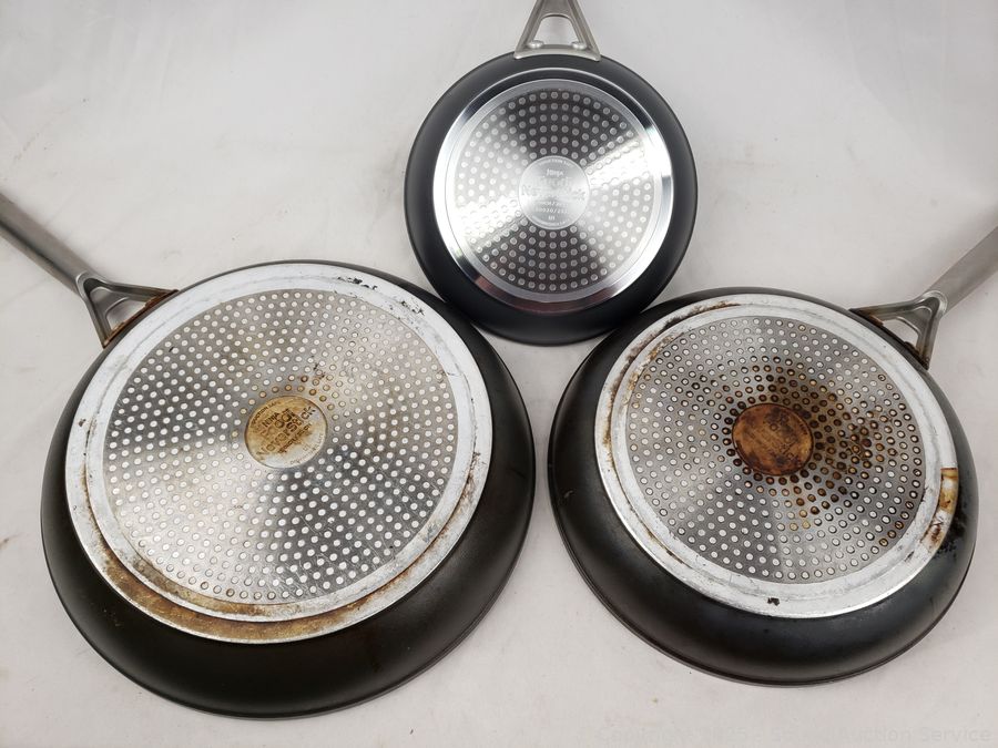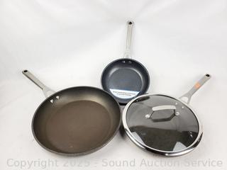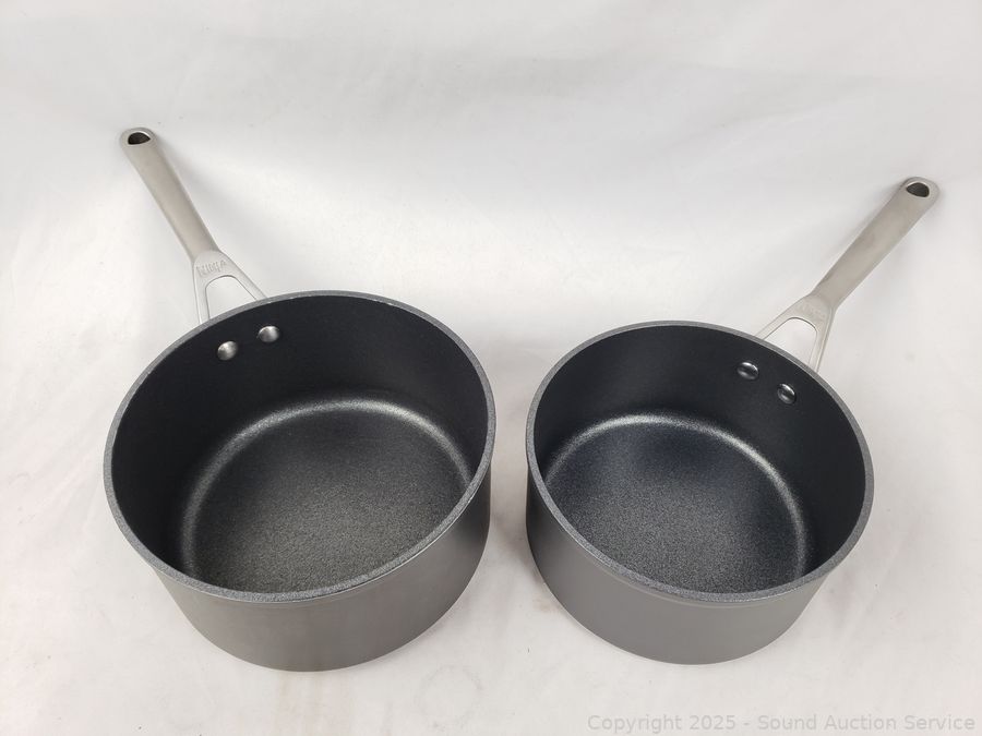 2.5qt, 3.5qt saucepans, 6.5qt boiling pots, 8", 10", 12" skillets, 12" chicken fry pan. 2 pans have signs of wear, the rest in excellent condition.