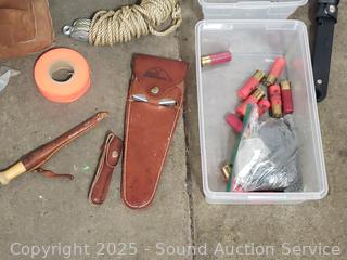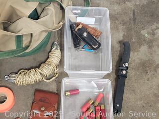 Vest, knives, tarp pouches, rope, shotgun shells, pellets, etc. Refer to photos for lot contents, more details.