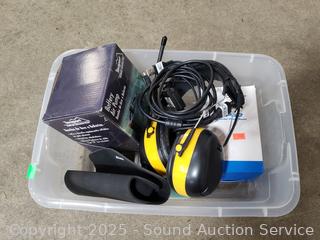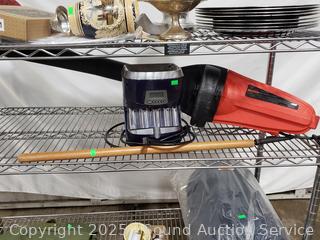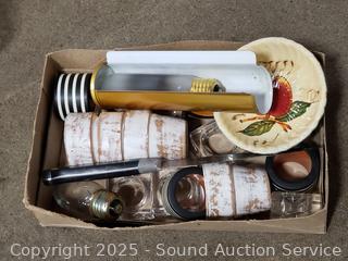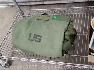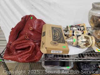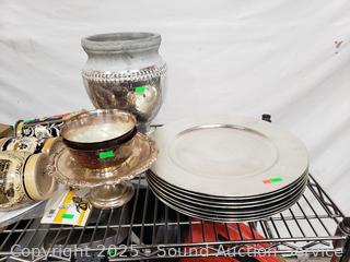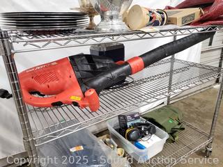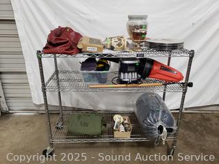 Military duffel, German steins, Elec. Black & Decker Leaf Blower, plate chargers, coin sorter, etc. Cart NOT included. ATTN: All items are used, may be missing pieces, damaged, not functioning, complete, no issues, etc. All items as is. Refer to photos for more details.