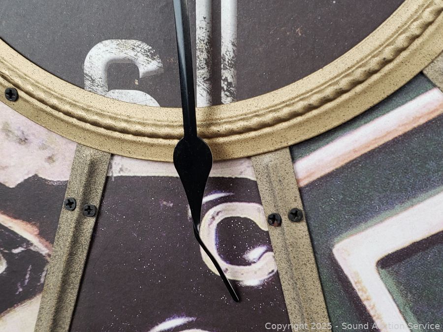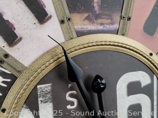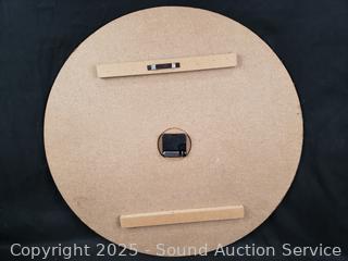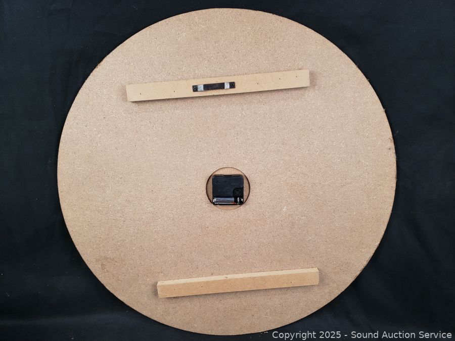 Clock is untested, hands are damaged, 24" Dia. 14" x 14", 12" x 16", 11" x 17". Some scuffs, wear to finish.